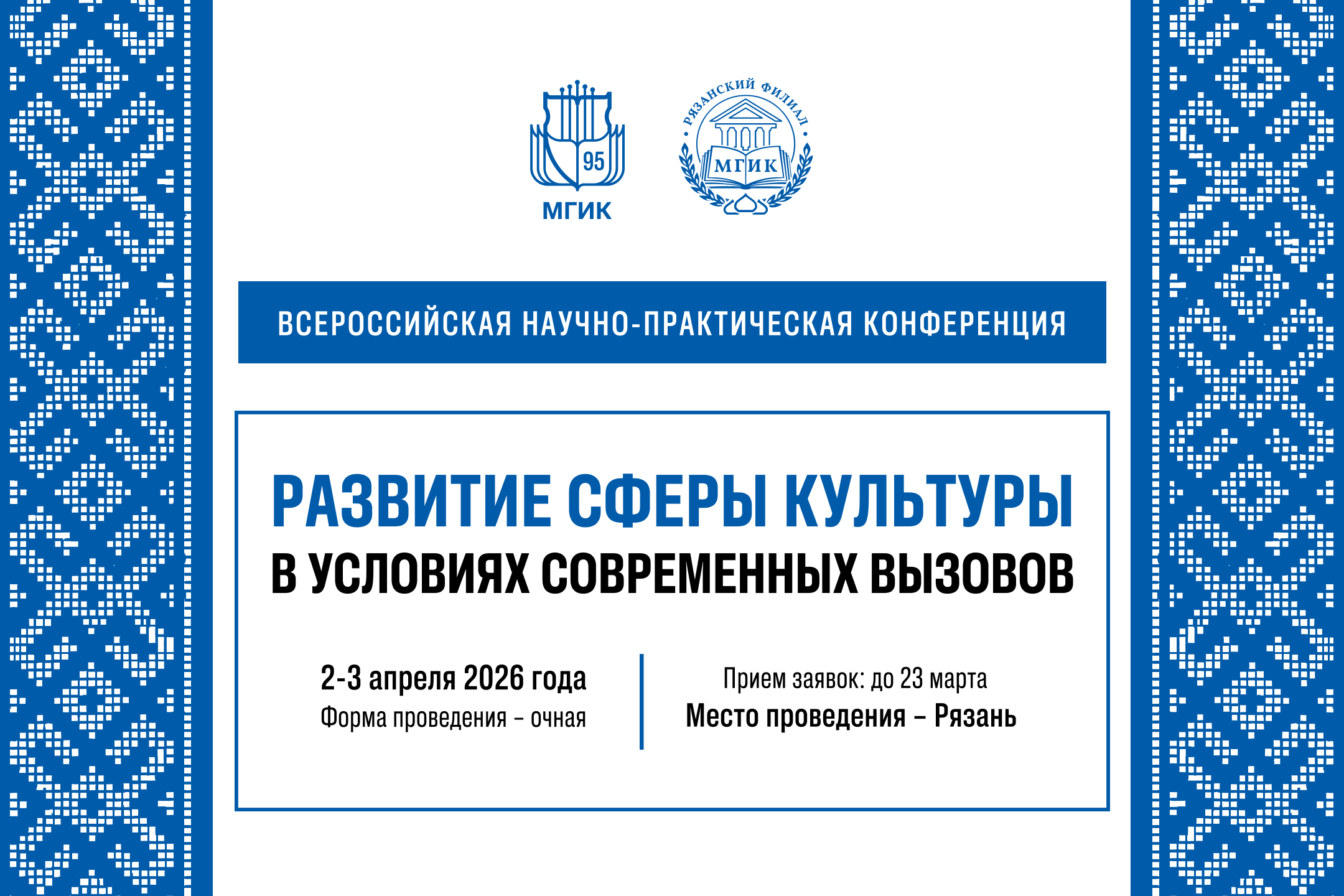 Рязанский филиал МГИК проведет Всероссийскую научно-практическую конференцию «Развитие сферы культуры в условиях современных вызовов», заявки на участие в которой принимаются до 23 марта 2026 г.